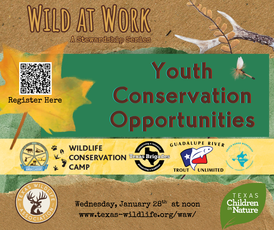 Our first Wild at Work webinar of the year focuses on organizations that offer conservation and education programming for Texas youth. Join us Jan. 28 from noon to 1 p.m. As always, our Wild at Works are FREE!
